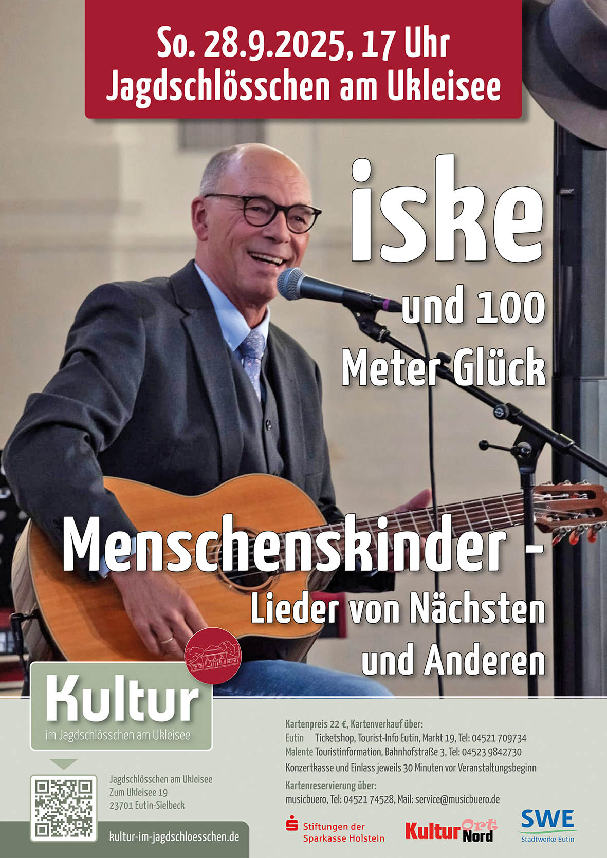 Das Finale unserer diesjährigen Konzertreihe wird vom Eutiner Singer/Songwriter iske und der Band 100 Meter Glück gestaltet.